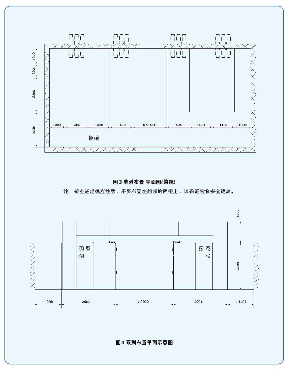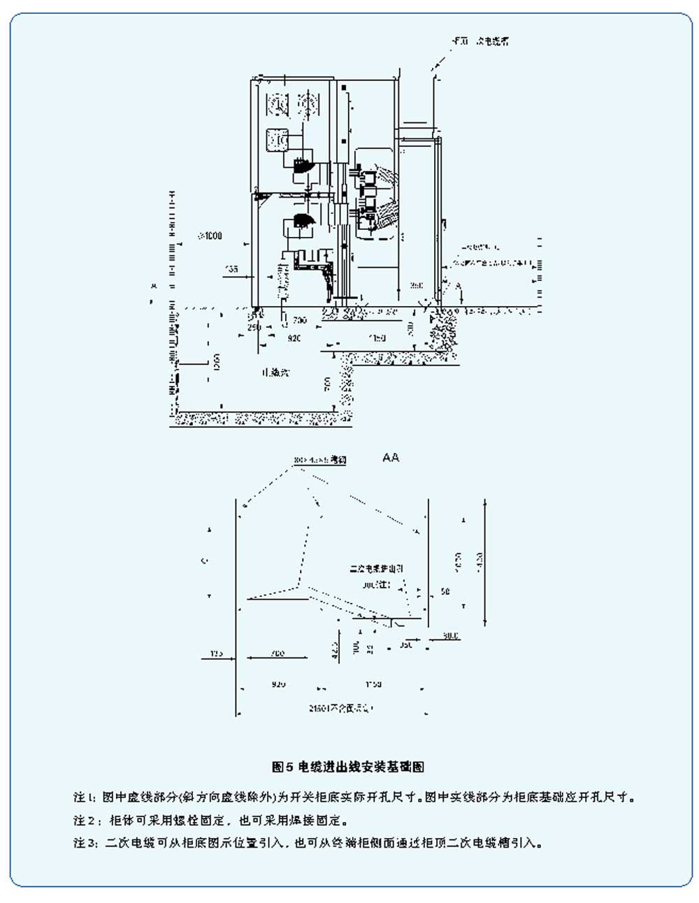 1. 安装开关柜的场所应符合产品样本中规定的使用条件: 2. 开关柜为不靠墙安装,平面布置分为单列布置和双列布置两种,设有母线桥,如图3~图4所示。并柜用紧固件已附在柜内有关安装孔上,并柜安装完毕后应将其紧固; 3. 开关柜安装时,手车之轨道不允许悬空,应紧贴地面; 4. 开关柜安装后,其前后左右垂直度偏差不得过1.5mm/1000mm; 5. 控制电缆由开关柜底部二次电缆沟引入,也可根据用户要求由开关柜端侧面引入; 6. 开关柜主回路的引入采用架空和电缆两种形式。架空进出线时需增加800mm深后柜(详见方案图中注1、注2)。进出线之电缆终端盒,由用户自备自装。 7. 柜前走廊应平整光洁,以便手车进入; 8. 开关柜安装基础槽钢及一、二次回路电缆沟的施工按图5、图6; 9. 安装开关柜的地面基础施工应符合“电力建设施工及验收技术规范”中的有关条款规定。为使手车推动便和减少尘埃,操作走廊以水磨石地面为佳。