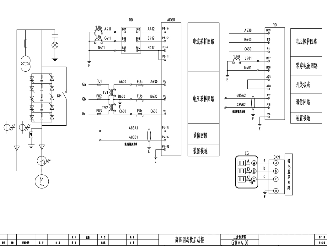 8. 技术要求 8.1高压固态软起动装置为一拖一方式,10kV输入,10kV输出。装置的功率单元为模块化设计,可方便从机架上拆出和更换,所有功率单元可以任意互换。满足长期连续运行的要求,起动、运行和停机迅速、安全可靠。 8.2高压固态软起动柜具有软起/直起/软停功能。 8.3高压软起动装置的进出线设计为下进下出,该装置应能满足两根YJV8.7/15-3*240电缆进出的要求。 8.4装置柜体的安装、调试和维修可在正面和背面进行。 8.5高压固态软起二次控制电源由现场提供,采用交流AC220V-50Hz容量为500VA。 8.6高压软起装置控制方式:能够实现三地控制,①软起柜操作②机旁控制箱操作③DCS集中控制。 8.7高压固态软起动柜旁路接触器提供二对常开、二对常闭无源接点。 8.8 高压固态软起动柜在不接通高压时可以通过低压380V/50Hz进行模拟调试,利用低压电动机及大功率灯泡模拟负载实现软起动的各项保护功能,为正式高压启动时提供启动依据。 8.9高压固态软起动柜安装方式:单独摆放。 8.10 软启动装置能满足业主电动机的正常起动要求,起动平稳、冲击小,控制动作可靠。 8.11 主要参数指标: 1)起动电流:鼠笼式电动机,按负载情况考核控制在2.0~3.5Ie内; 2)单次起动时间的*大调节范围在30%以内。*大范围10~60S; 3)*大限度地减少起动压降?以稳定电网质量; 4)允许连续起动次数为:2~3次。但需满足产品温度运行及控制要求; 6)软启动装置有自检(包括电网检测)、加速校正、故障报警等功能。 7)软启动装置具备就地和远程控制起、停车功能,提供电动机联锁需要I/O接点。 9.一次方案原理图 9.1合同签定后一周内将全套图纸提供给需方。