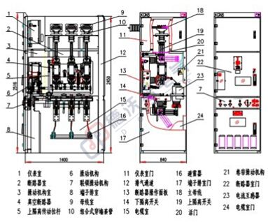 2, the circuit breaker room is located in the middle of the front part of the cabinet body is, using a circuit breaker has the advantages of novel structure, excellent performance of vacuum circuit breaker. Circuit breaker chamber is provided with a pressure releasing chamber, to release internal fault electric arc generated by the pressure to ensure switch cabinet and the safety of the operator; cabinet door is provided with an inspection window, observable isolation switch position.