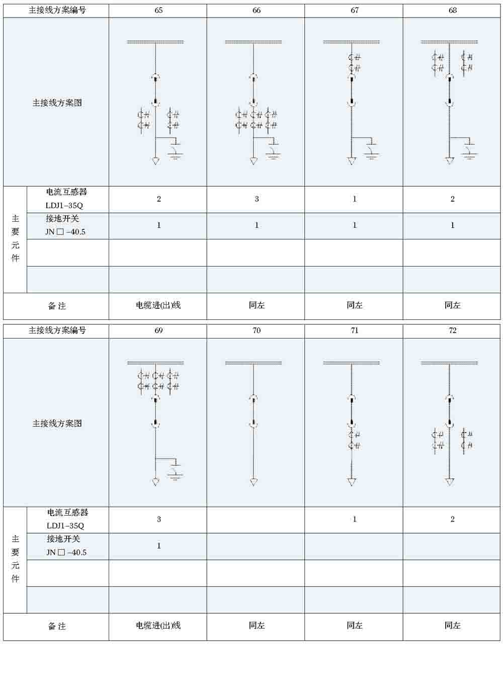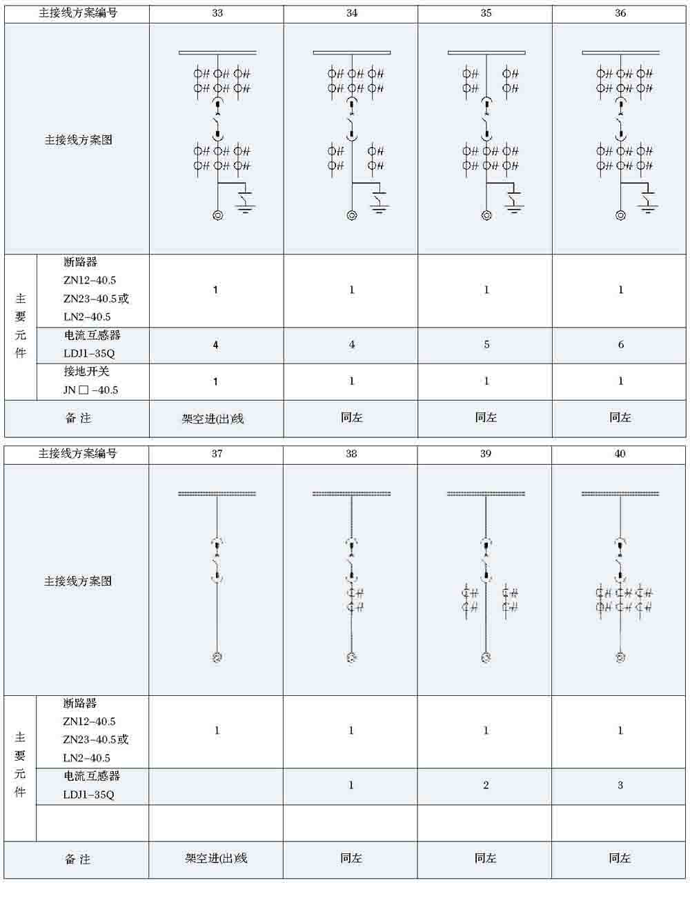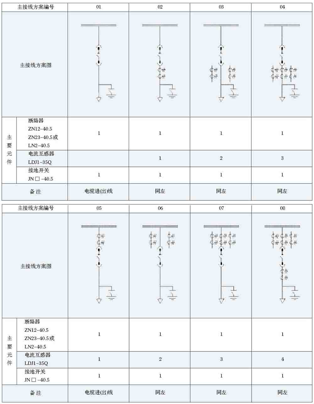 KYN10-40.5KV开关柜为金属铠装式结构,防护等级为IP2X,分柜体和手车两大部分。一次主接线方案见表8,产品外形尺寸和安装尺寸见图1、图2。 注意:当一次方案中架空(或电缆)进出线方案作为进线柜时,必须取消接地开关。