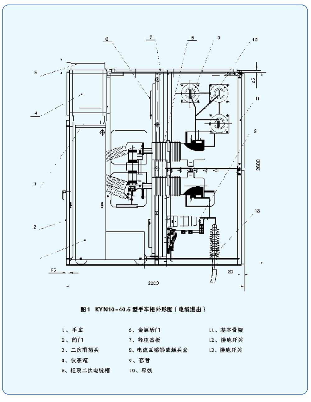 1、柜体 柜体用型钢和钢板焊接而成,主要分为四个室:手车室、主母线室、接地开关及进出线室、继电器室,手车室设有压力释放通道,手车在手车室内可以有断开、试验位置和工作位置,手车室与主母线室、接地开关及进出线室间用触头盒或触头盒式电流互感器连接,触头盒前设有金属活门,手车室顶部设有二次插座,另外手车室还具有识别手车位置、加热器等,主母线室内采用绝缘母线,柜与柜之间用隔板和套管隔开,以防事故扩大。接地开关进出线室内装设有带关合能力和带电显示的接地开关,以及开关柜进出线电缆的连接头。继电器室通过减震器安装在柜体,供安装仪表、继电器及小母线等用。 2、手车 手车车架由型钢和钢板焊接而成,根据一次接线方案需要,分断路器手车、隔离手车、电压互感器手车、避雷器手车、所用变压器手车等,同类型规格手车具有互换性,手车面板即为开关柜门,装有铭牌、观察窗等,手车底部设有四个固定轮,当需要在柜外移动时,可装设一只方向滚轮,使前两个固定轮抬空,另外手车设有锁定装置和省力推进装置等。 3、联锁 KYN10-40.5型开关柜设有可靠的防止误操作联锁装置,可实现“防止误分误合断路器、防止带负荷进出手车、防止带电合接地开关、防止接地开关关合时送电、防止误入带电间隔”的五防要求。另外,隔离手车与对应的断路器手车之间设有电气取锁,所用变压器手车设有进工作位置前不能带负荷的取锁等等。