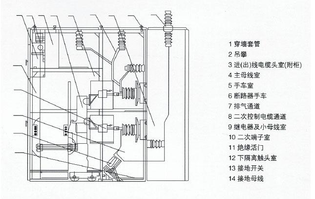 JYN1-35型开关柜系根据国家标准GB3906-2020和国际电工委员会IEC62271-200标准进行设计的。开关柜由柜体和手车两大部分组成。柜体为角钢板弯制焊接而成,并分割为手车室、母线室、电缆室、继电器室等。手车室与电缆室、母线室之间,隔以绝缘材料制成的隔板并在其上设有绝缘活门,其它各个室之间均以接地的金属板隔开,属于间隔型移开式开关柜。 手车按用途分为断路器手车、避雷器手车、“V”形接法电压互感器手车、“Y”形接法电压互感器手车、单相电压互感器手车、隔离手车和站用变压器手车等七种。 开关柜与断路器外形尺寸见图4。 开关柜系空气绝缘。能保证同类型同规格的手车具有互换性,但可限制不同类的手车推入。手车与柜体通过二次插头进行电气上的联锁。二次插头有24芯触点,其额定电流为15A。 开关柜内部结构参见图5。 现对开关柜结构按不同用途简述如下: 1. 外壳 开关柜的外壳具有IP2X的防护等级,能够防止手指或直径大于12mm的物体接近柜内带电部分和触及运动部。开关柜的地面属于外壳的一部分,因此用户在设计时(例如电缆沟)应考虑到防护等级的要求,必要时向制造厂询问。 2. 手车室 手车室设在柜前正中央,手车进入或退出时,小室大门可以关闭,小室底部中央设有手车导轨和接地装置。小室通向一次静触头的绝缘隔板是装有可随手车进出自动开启和关闭的绝缘活门,以策安全; 在手车轨道入口处设有两个可以上下翻动的活动引轨,见图6。 3. 主母线室 主母线室设在柜体上部,设有三相主母线、支撑绝缘子、静触头座或电流互感器、及上隔离触头盒等。 4. 电缆室 电缆室设在母线室的下部,与母线室之间有金属板相隔,它除供装设电流互感器、支撑绝缘子、触头座和下隔离触头盒之外,接地开关或联络母线亦设置在该室内。 5. 继电器室 在开关柜的正面上部,仪表室有效安装面积为2(高600×宽800)了;继电器室设有摇门,其有效安装面积为2(高550×宽650)。二次小母线及其专用端子组也设在该小室内。 6. 接地导体 横贯于开关柜的宽度方向上的铜质接地导体装设在开关柜的后下方。两台开关柜之间的连接采用不小于200mm2的铜质连接头,用螺栓搭接即可。接地导体两端备有M12螺栓,供与变电站内接地线连接用。 7. 手车识别装置 本装置机由装于手车左侧下方的3件挡块与装于柜内对应位置的2件柱销组成。它的作用是使不同类型的手车不能互换,同类型同规格的手车可以互换。各种手车的识别装置编码方式由制造厂根据用户所订开关柜手车类型而定。 8. 联锁 开关柜对操作程序性联锁作了充分的考虑,可以实现以下要求: a) 当断路器处于合闸状态时,手车不可能在工作位置或试验位置移动; b) 当手车在工作位置与试验位置之间时断路器不能合闸; c) 当接地开关处于合闸状态时,手车不能从试验位置推至工作位置; d) 当手车在工作位置或工作与试验位置之间时,接地开关不能进行合闸; e) 二次插头接通以前,手车不能从试验位置推至工作位置; f) 当手车需要拉出时,若二次插头插座未解开,则手车不能离开试验位置; g) 开关柜还设有周全的防止电气误操作装置。