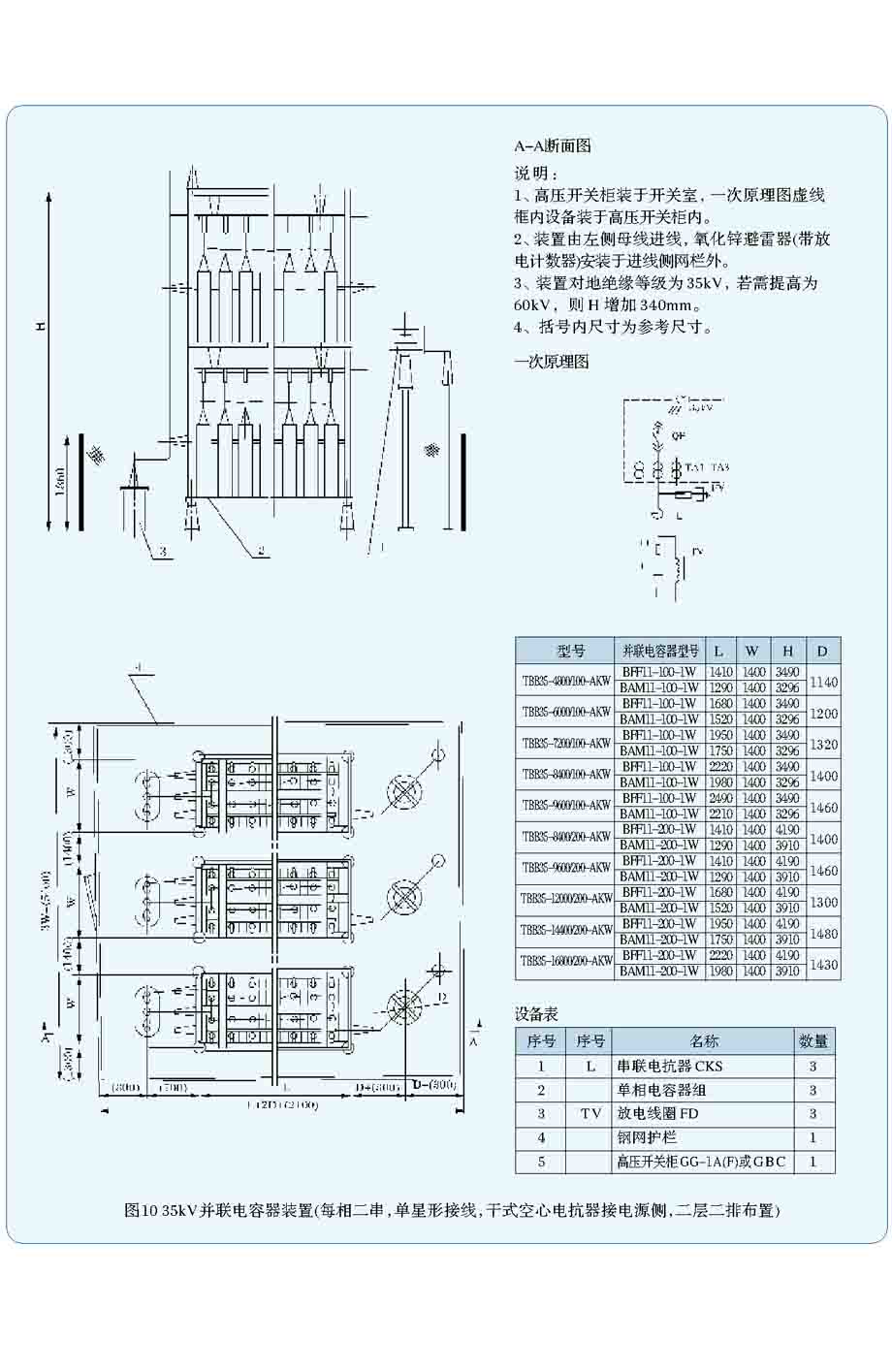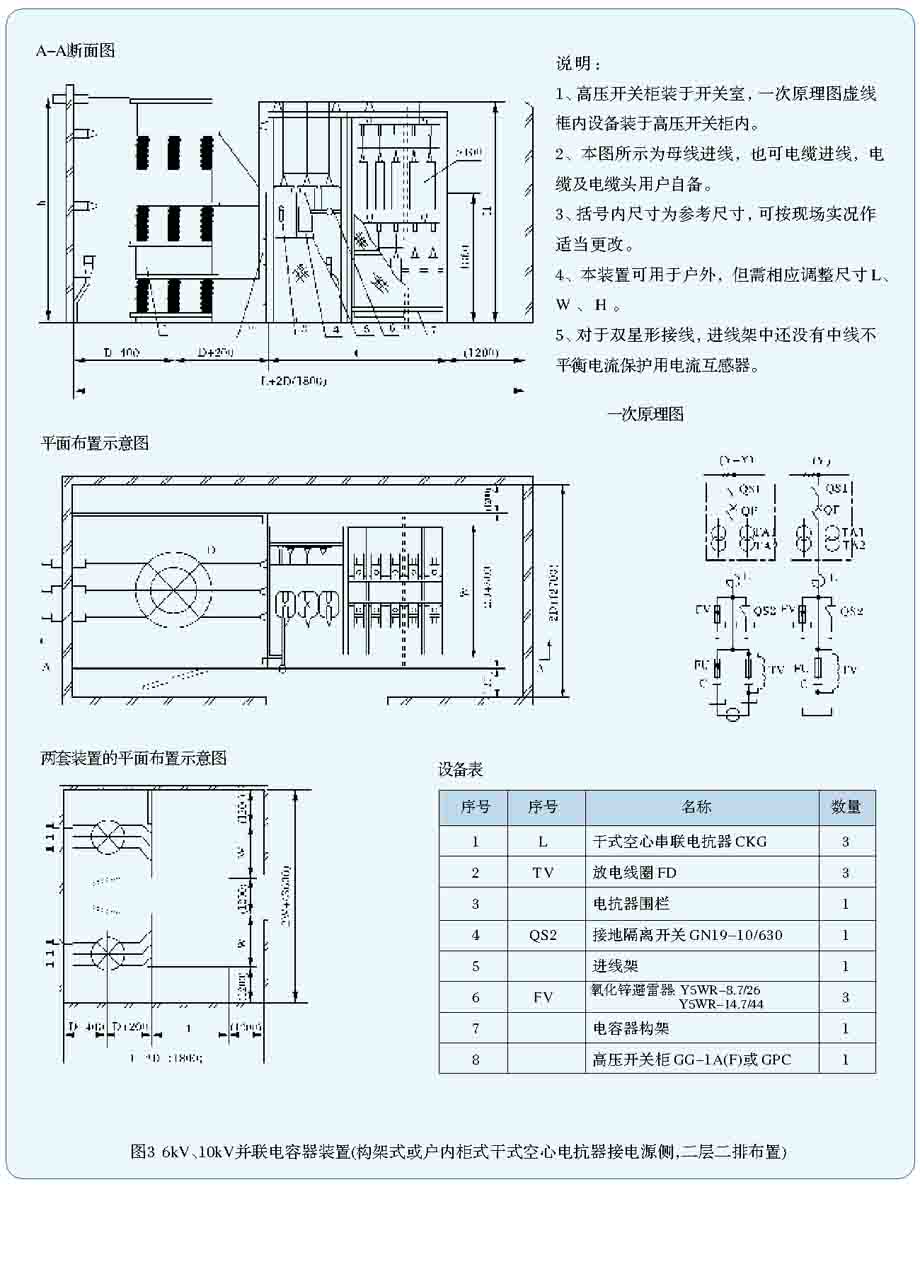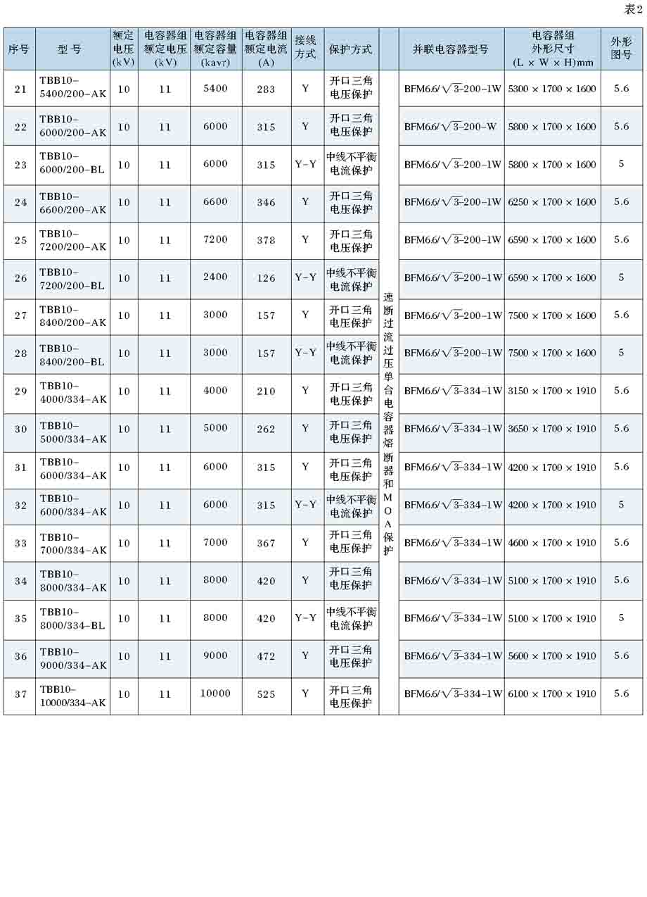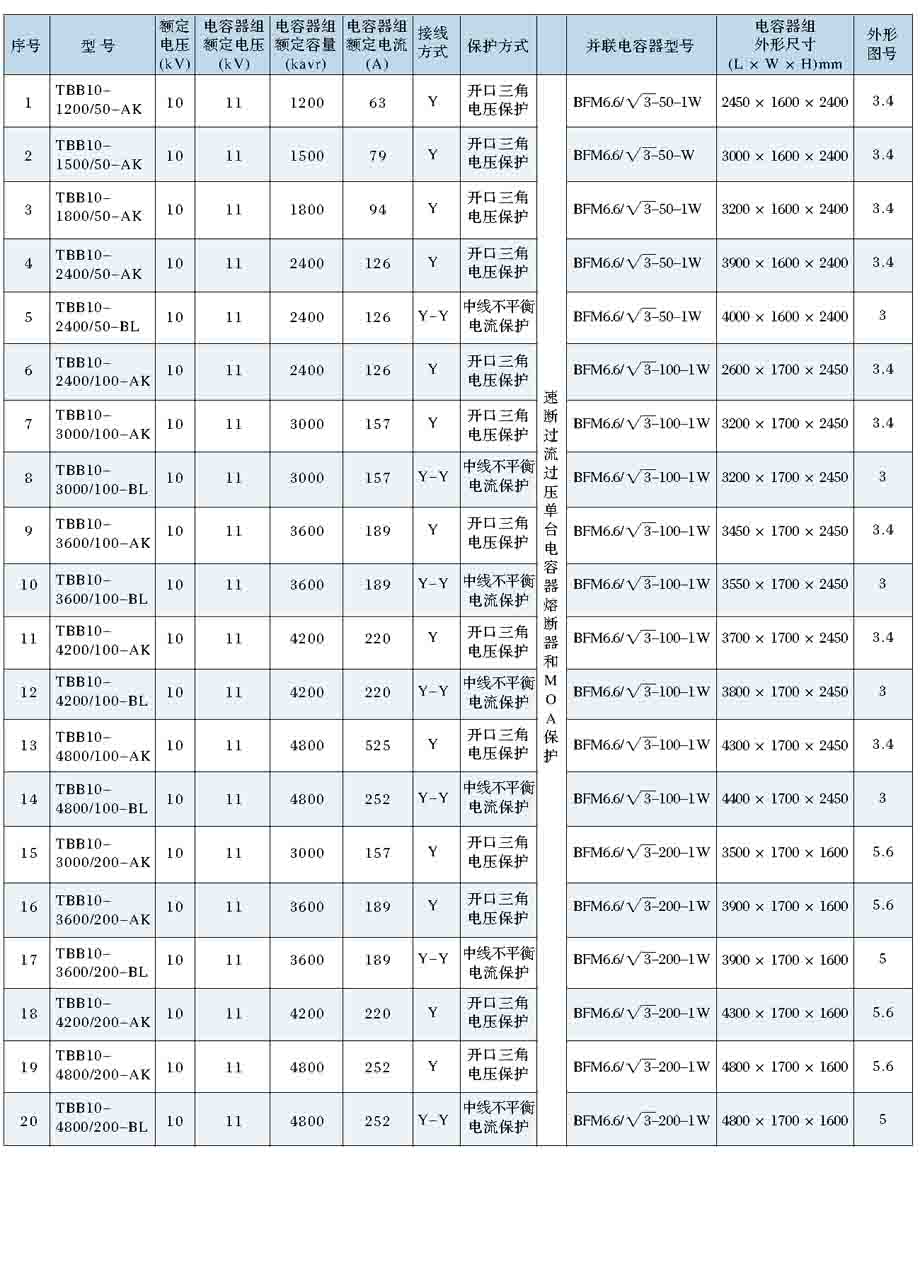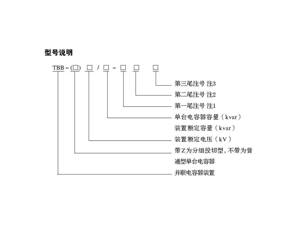 高压并联电容器补偿装置(以下简称装置)主要用于工频6kV。10kV,35kV的三相电力系统,用以调整、平衡变电站网络电压,提高功率因数,降低损耗,提高供电质量。 注1:A表示Y接线,B表示Y-Y接线。 注2:K表示开口三角电压保护,C表示电压差动保护,L表示中线不平衡电流保护。 注3:W表示户外装置,如不标注则为户内。 例如:TBB10-4800/100- AK 表示装置额定电压为10kV,装置额定容量为4800kvar,单台电容器容量为100kvar,Y接线,开口三角电压保护的户内式并联电容器装置。