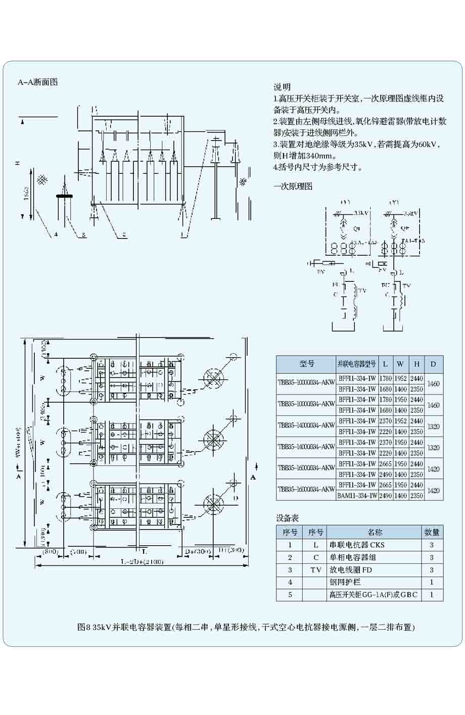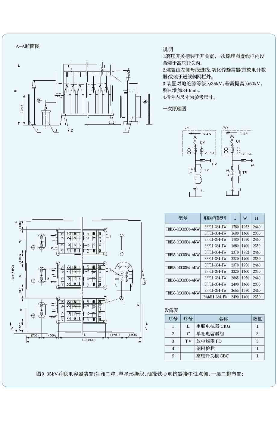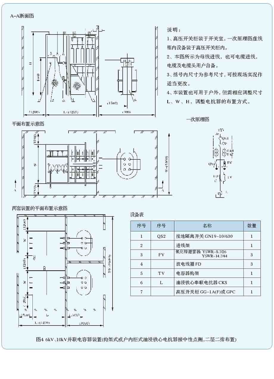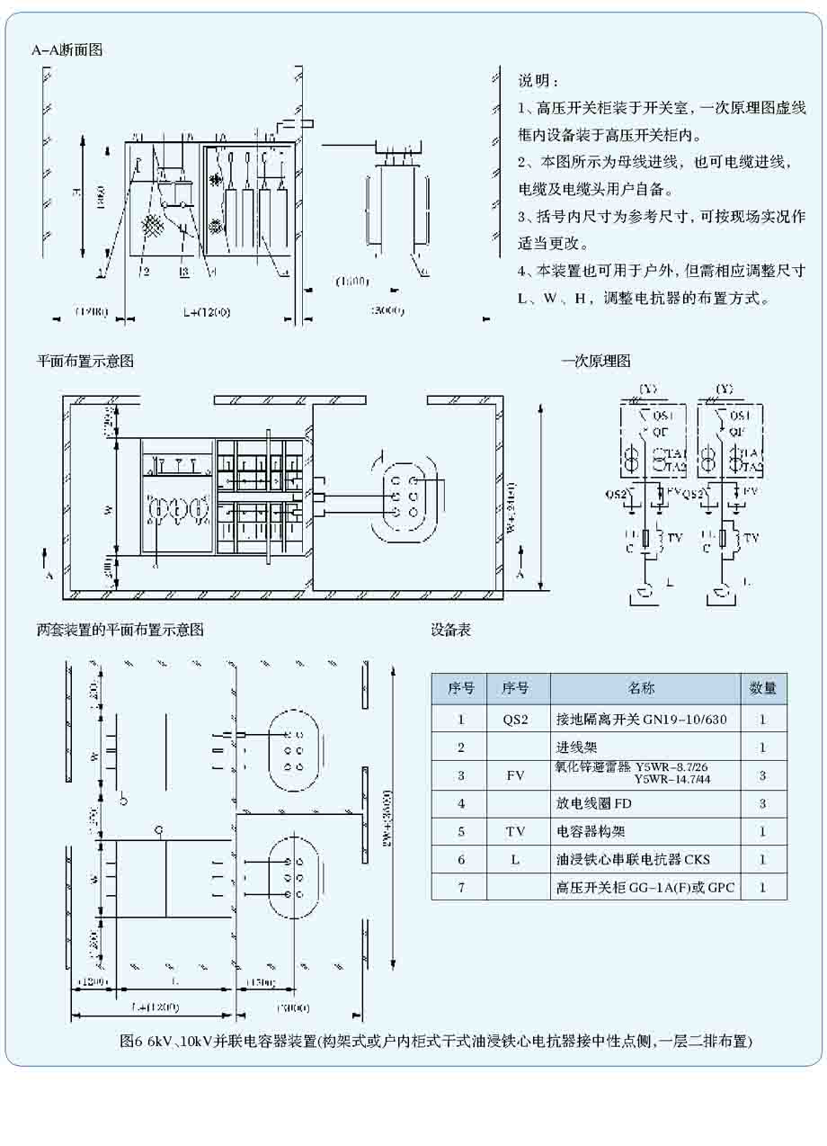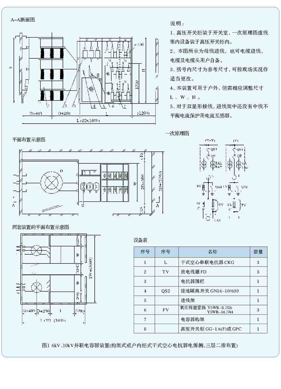 高压并联电容器补偿装置(以下简称装置)主要用于工频6kV。10kV,35kV的三相电力系统,用以调整、平衡变电站网络电压,提高功率因数,降低损耗,提高供电质量。 注1:A表示Y接线,B表示Y-Y接线。 注2:K表示开口三角电压保护,C表示电压差动保护,L表示中线不平衡电流保护。 注3:W表示户外装置,如不标注则为户内。 例如:TBB10-4800/100- AK 表示装置额定电压为10kV,装置额定容量为4800kvar,单台电容器容量为100kvar,Y接线,开口三角电压保护的户内式并联电容器装置。