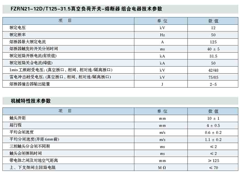 预装式变电站高压一般采用负荷开关——熔断器组合电器保护,熔断器—相熔断后,三相联动脱扣,负荷开关有产气式、压气式、真空、六氟化硫等型式可选,可配电动操作机构,实现自动化升级;熔断器为高压限流熔断器,带撞击器,动作可靠,开断容量大,主要技术参数见下表。对于800kV以上的变压器,可选用ZN12,ZN28,VS1等真空断路器保护。