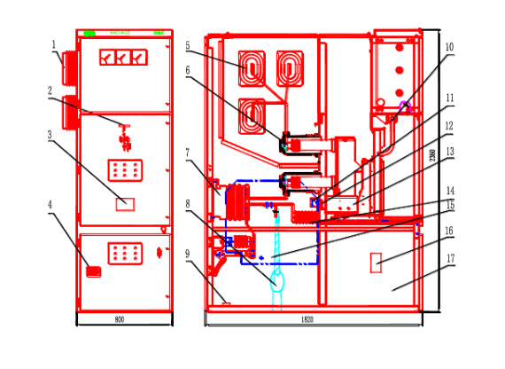 1、穿墙套管 2、模拟母线 3、铭牌 4、照明灯 5、主母线 6触头盒 7、电流互感器 8、一次电缆 9、接地母排 10、二次连锁装配 111、绝缘弯板 12、活门机构 13、断路器手车 14、绝缘子 15、绝缘板 16、加热器 17、柜体框架